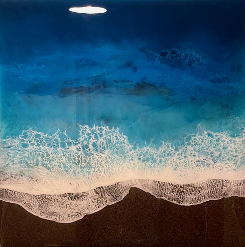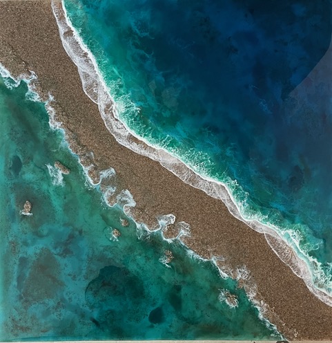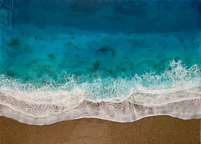 Mes tableaux offrent des vues aériennes de plages et de lagons, où les vagues ondulent et dansent sur le rivage dans une harmonie de bleus. Chaque œuvre invite à la contemplation, tandis que l’effet mousseux des vagues, obtenu par un travail minutieux de la résine, confère un réalisme saisissant, presque vivant.