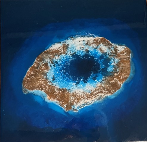 Depuis plusieurs années, je développe une technique mêlant résine époxy, pigments et textures naturelles afin de restituer la vie sous marine, l’effet de profondeur et le mouvement.